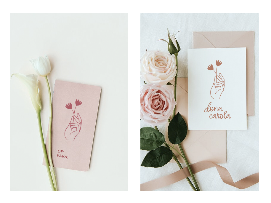 Como sua idéia não era restrita apenas as flores, fizemos 3 assinaturas para o símbolo da marca: mãos que entregam flores, entregam amor e entregam lembrança.