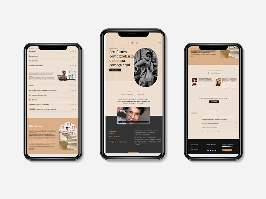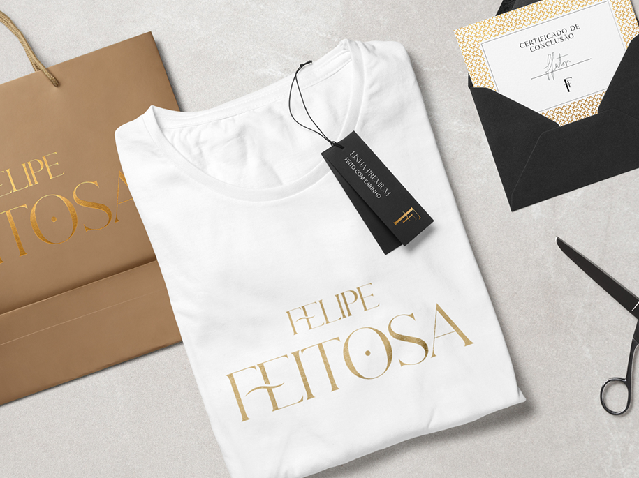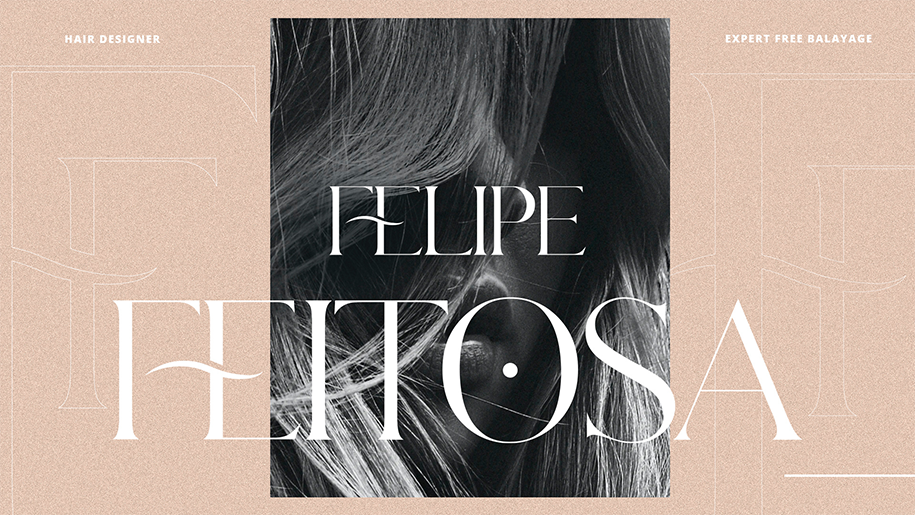 Trabalhamos a assinatura do Hair Stylist Felipe Feitosa usando uma tipografia com contraste na espessura e o formato da onda, representando movimento e as mechas, mas ao mesmo tempo, com um resultado minimalista e sóbrio.