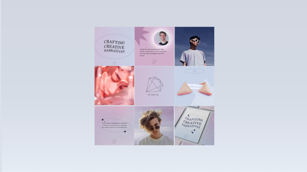 A Trine CC é uma boutique criativa cuja missão é construir narrativas que proporcionam leveza, entretenimento e conexão genuína entre marcas, talentos e consumidores. O diamante, símbolo do logo, representa as profundas conexões e o valor do método único da empresa que envolve 6 pontas = 6 etapas.